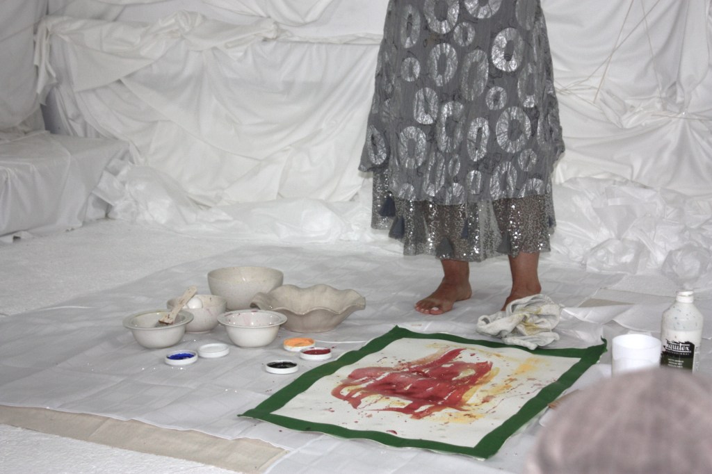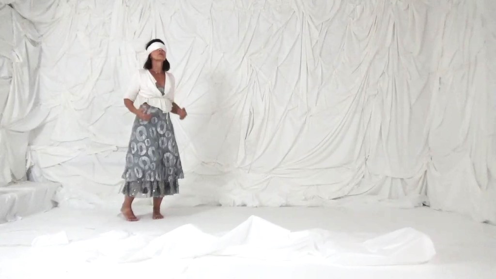 Mais voici qu’elle franchit une nouvelle limite dans son grand œuvre personnel, en signant une performance pluridisciplinaire qui combine écriture, interprétation théâtrale et exécution en direct d’un portrait féminin archétypal selon la technique ancestrale a tempera. Le tout dans une chambre blanche, toute blanche, l’espace de son atelier retapissé pour l’occasion de toile immaculée froissée et liée qui n’est pas sans rappeler directement les célèbres emballages de Christo.