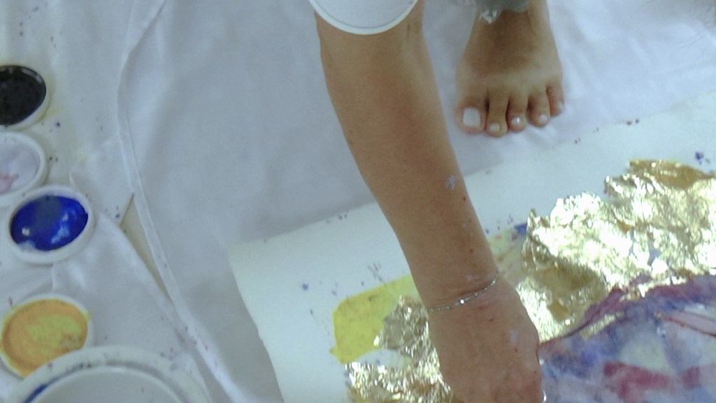 La performance À Tempéra est un tournant dans la pratique de Fabienne Roques. Au geste de peindre elle joint la danse et la parole, soutenus par un texte dense et poétique.