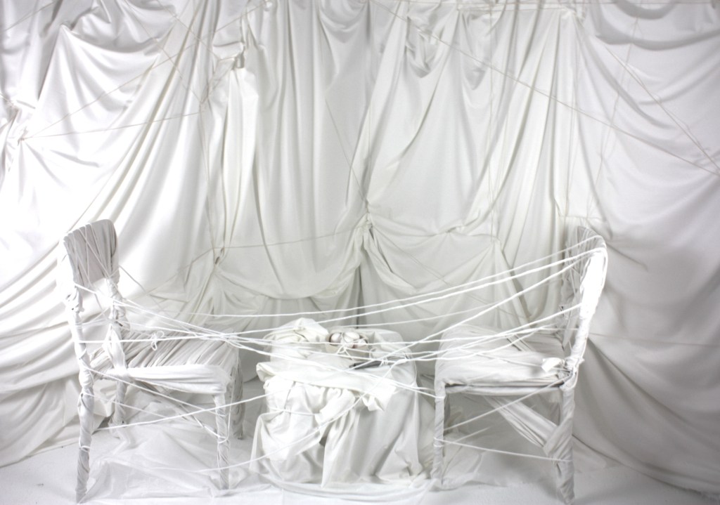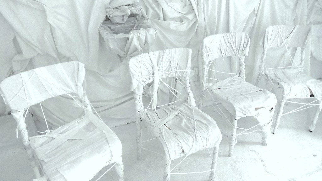 La partie théâtre de l’atelier est recouverte du sol au plafond de tissu blanc, retenu par de la ficelle. Les chaises sont elles aussi emballées.