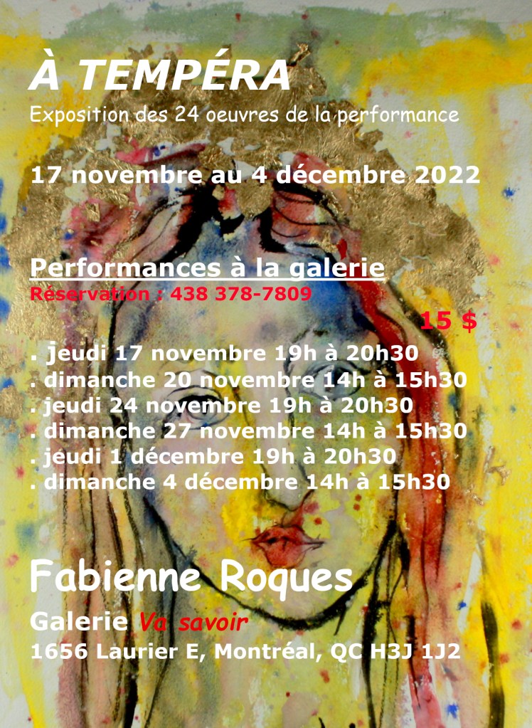 Si vous voulez plus de renseignements concernant la performance et l’exposition À tempéra, vous pouvez communiquer avec Franz Roussel, ou Fabienne Roques.