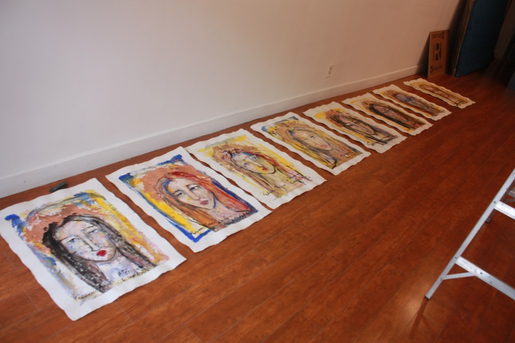 Les œuvres sur papier 78 x 56 cm sont peintes selon la technique très ancienne de la tempéra qui consiste en une émulsion de jaune d’œuf, de pigments et d’eau. Cette technique était utilisée au moyen-âge ; elle l’est encore aujourd’hui, par les peintres d’icônes byzantine.