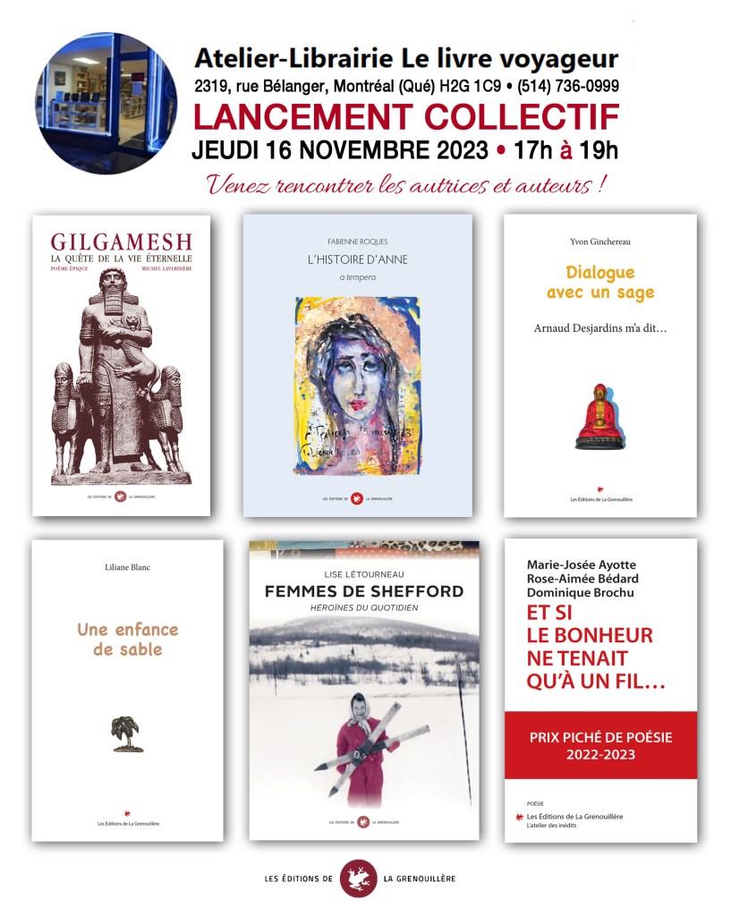J’ai le plaisir de vous inviter au lancement collectif d’automne des Éditions de la Grenouillère le jeudi 16 novembre 2023 de 17h à 19h.