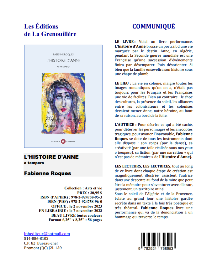 À cette occasion, j’aurai le plaisir de vous faire découvrir mon livre: L’HISTOIRE D’ANNE a tempera publié au Québec par LES ÉDITIONS DE LA GRENOUILLÈRE.